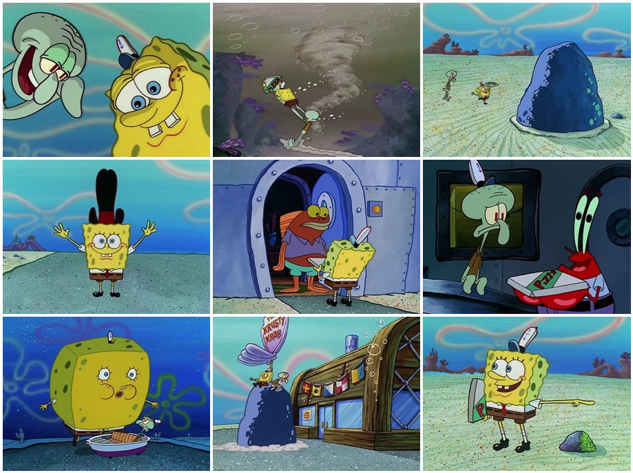 [the pizza delivery fish looks at the pizza, and then slides it through the mail slot onto a plate that spongebob is holding in his hands, and then he gives the pizza delivery dish a dime through the mail slot.] and this is for you. Krabs' house] must be a full moon. We may not see the spongebob movie for a while, but we can sill find some sins in some of your favorite episodes!